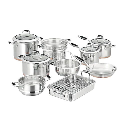 This SCANPAN Coppernox 9-piece set expands on traditional cookware with its unique construction. The set consists of all the pieces you will ever need - 16cm and 20cm saucepans, 24cm/4.8L dutch oven, 24cm/7.2L stockpot, 26cm frypan, pasta insert, top basket steamer, 20cm steamer for saucepan, and handy 33 x 24cm roaster.