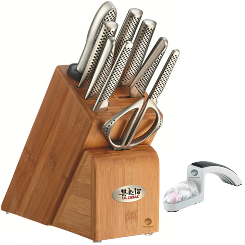 Global Takashi Knife Block Set 10 Piece + Minosharp Knife Sharpener