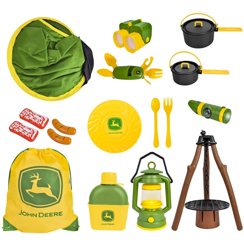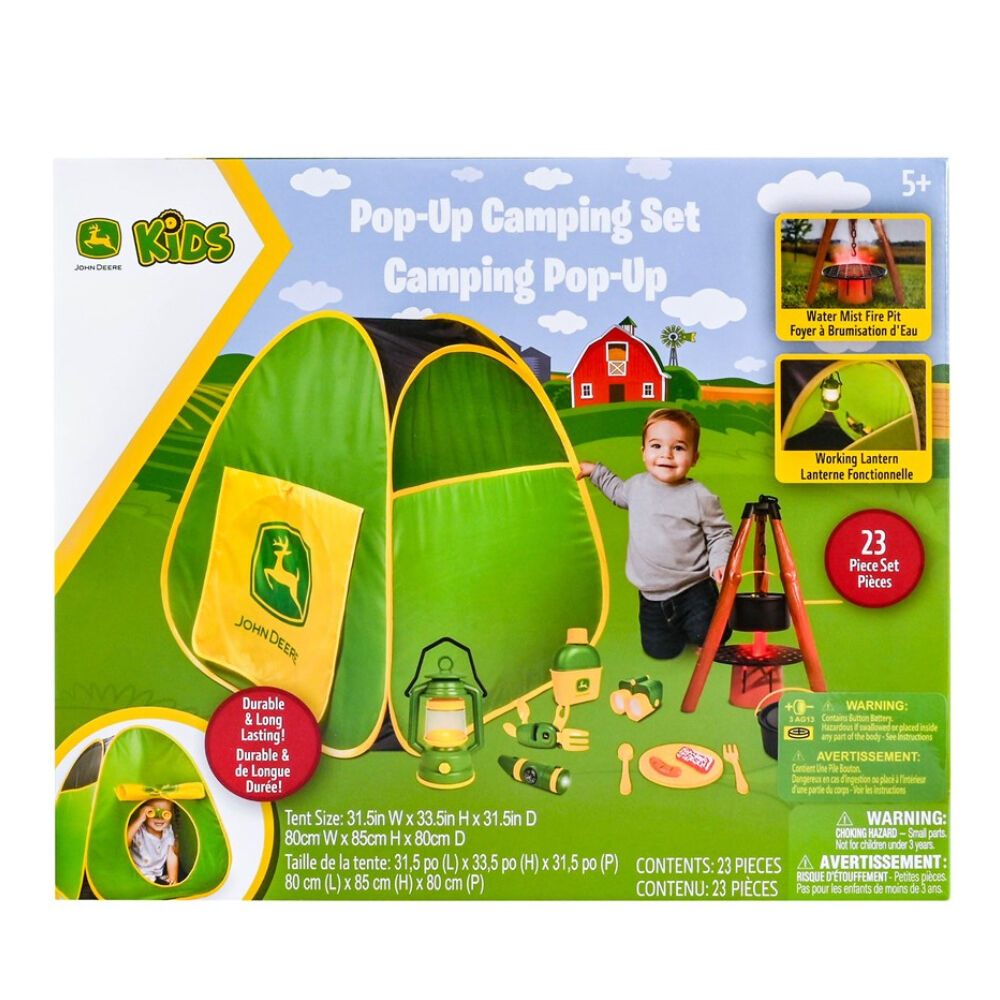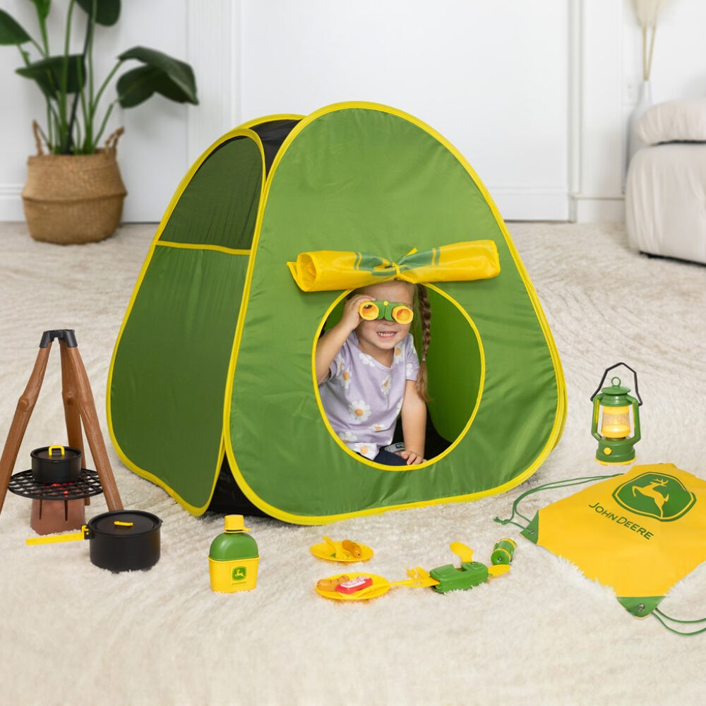 Bring outdoor adventure into your home or garden with the John Deere Pop-Up Camping Tent Set. Featuring a triangle-shaped tent with signature John Deere graphics and a range of fun accessories, this set inspires imaginative play and outdoor-themed adventures.