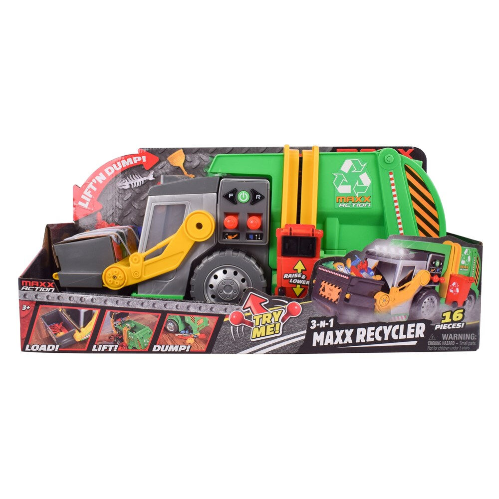 The MAXX Action Motorised 3-in-1 Recycle Truck is a feature-packed, large-scale toy designed to replicate real-life recycling truck action. Children use dual joystick controllers to lift, dump and drive the truck; it includes flashing lights, realistic engine sounds, motorised forward/reverse drive and comes with a number of fun accessory trash items. Suitable for kids aged 3 years and up.