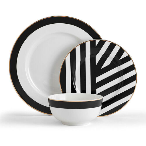 - Made from delicate fine china, this luxury tableware set boasts a striking monochrome aesthetic that’s enhanced with a genuine gold rim for the ultimate dining experience.