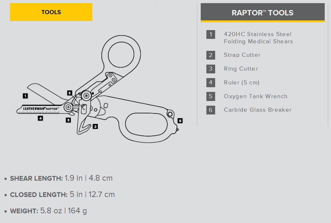 The Leatherman Raptor features the necessary tools for uniformed professionals to safely and quickly go to work in an emergency situation. Developed with the input of special operations medics, EMTs and fire professionals, the Raptor has just the right balance of multipurpose features for medical-specific ops without an overkill of tools to complicate sometimes life-threatening situations. When it's a question of survival, the Raptor answers loud and clear.