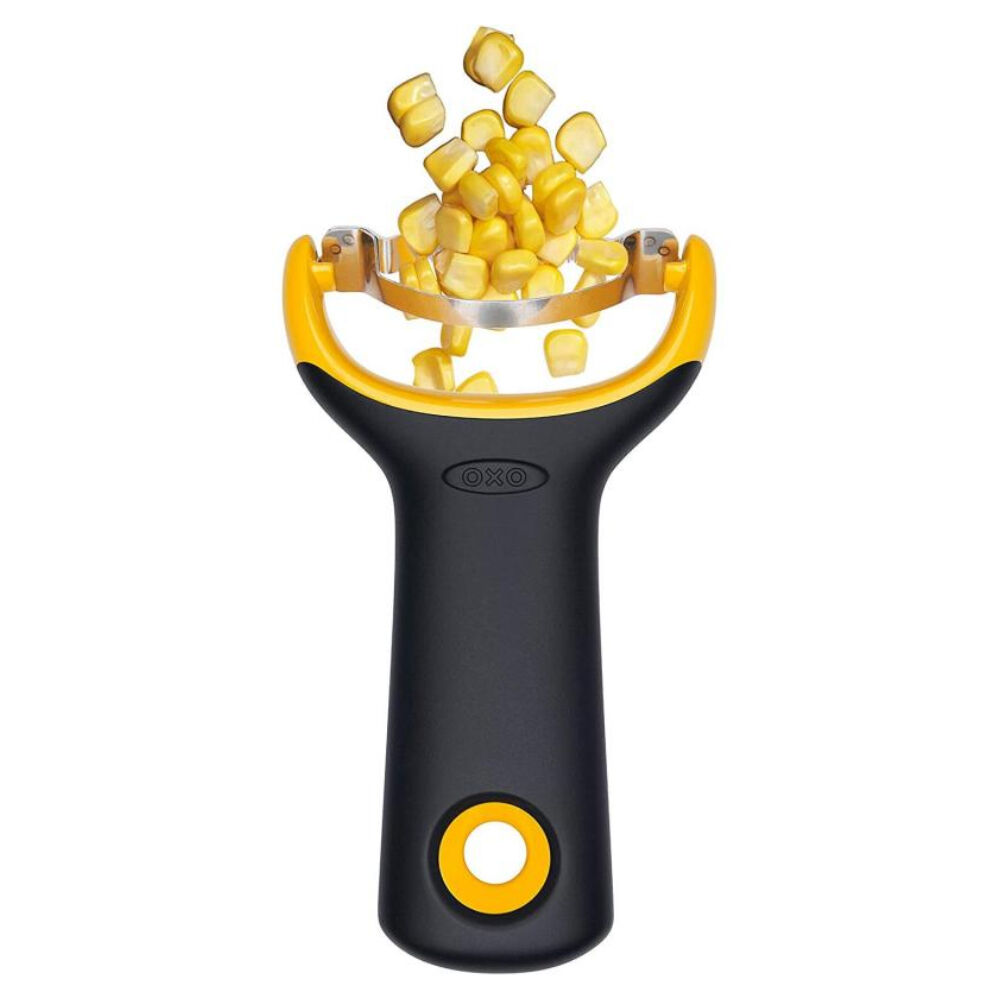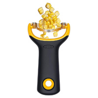 Remove kernels from corn cobs quickly and safely with the OXO Good Grips Corn Prep Peeler. Its compact design features sharp, rust-proof stainless steel blades and an ergonomic non-slip handle for comfortable control, even during extended prep sessions.