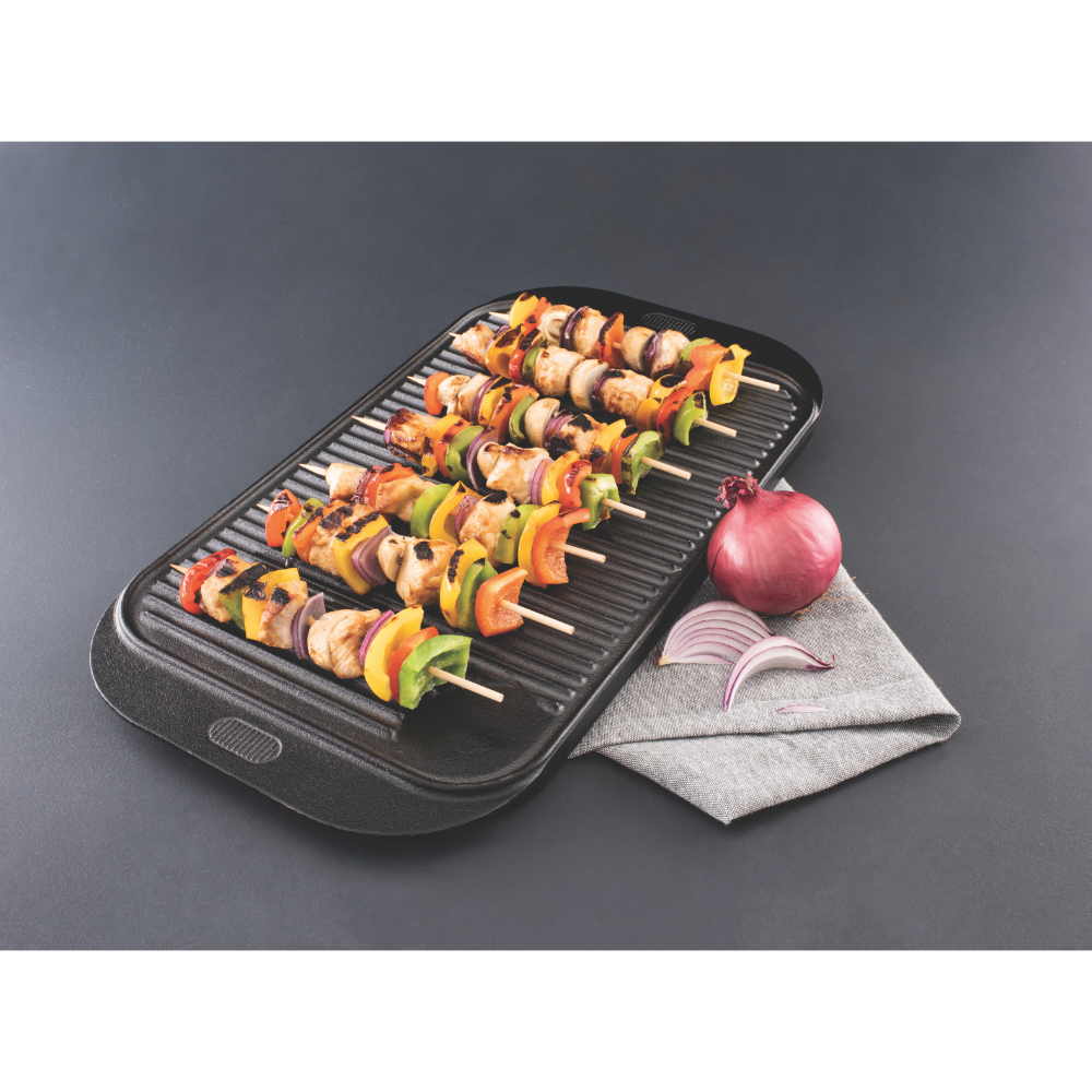 This PYROCAST 48 x 26cm Rectangular Grill Tray is a generous size to cook for a crowd, indoors or outdoors. The grill surface is perfect for cooking meats and fish, turn over to the smooth side for eggs and pancakes. Features built in handles for easy carrying or rotating. Rectangular design allows for skewers of prawns, chicken, steak or vegetables. Grooved surface creates professional sear marks on your food.