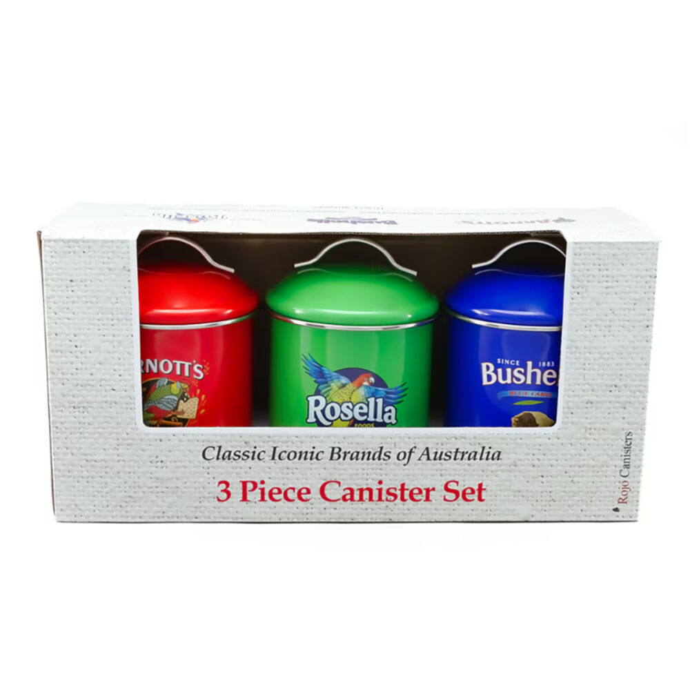 Bring a touch of vintage Australian charm to your kitchen with this Rojo canister set featuring classic Arnotts, Bushells, and Rosella branding. Designed for both style and practicality, these storage canisters are perfect for keeping pantry staples fresh while adding a nostalgic decorative touch to your benchtop.