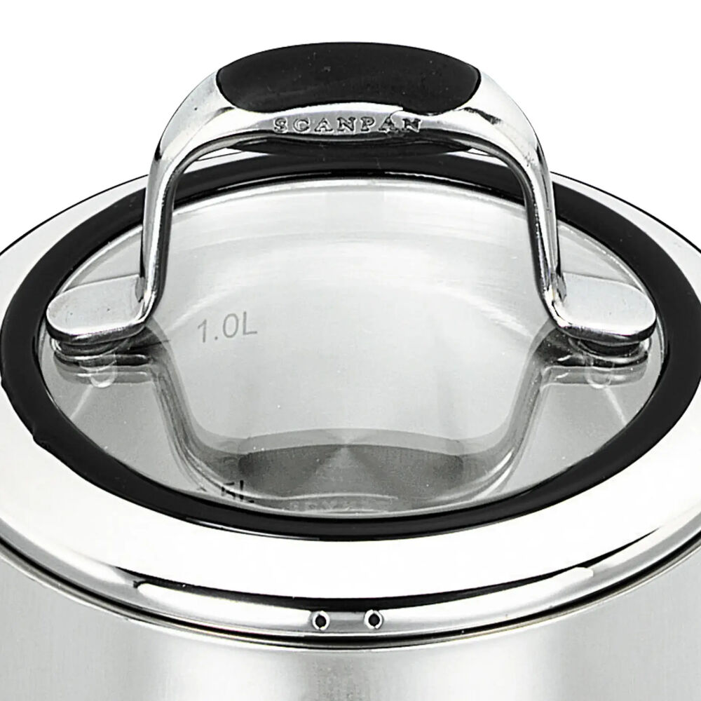 This Scanpan Coppernox 14cm/1.2L saucepan expands on traditional cookware with its unique construction. The base is impact bonded with a copper wedge for rapid and even heat distribution. To assist with heat retention and elimination of hot spots, the copper wedge is enveloped by 2 layers of aluminium with stainless steel surrounding the entire piece. This combination provides optimal heat diffusion and control. The sturdy lid with stainless steel rim and tempered glass insert allows you to view the cooking process. The range features cast stainless steel handles with soft touch and comfortable silicone inserts and a internal mirror polished 18/10 stainless steel finish with capacity markings. The range is suitable for all energy sources, including induction. It is oven safe to 220°C.