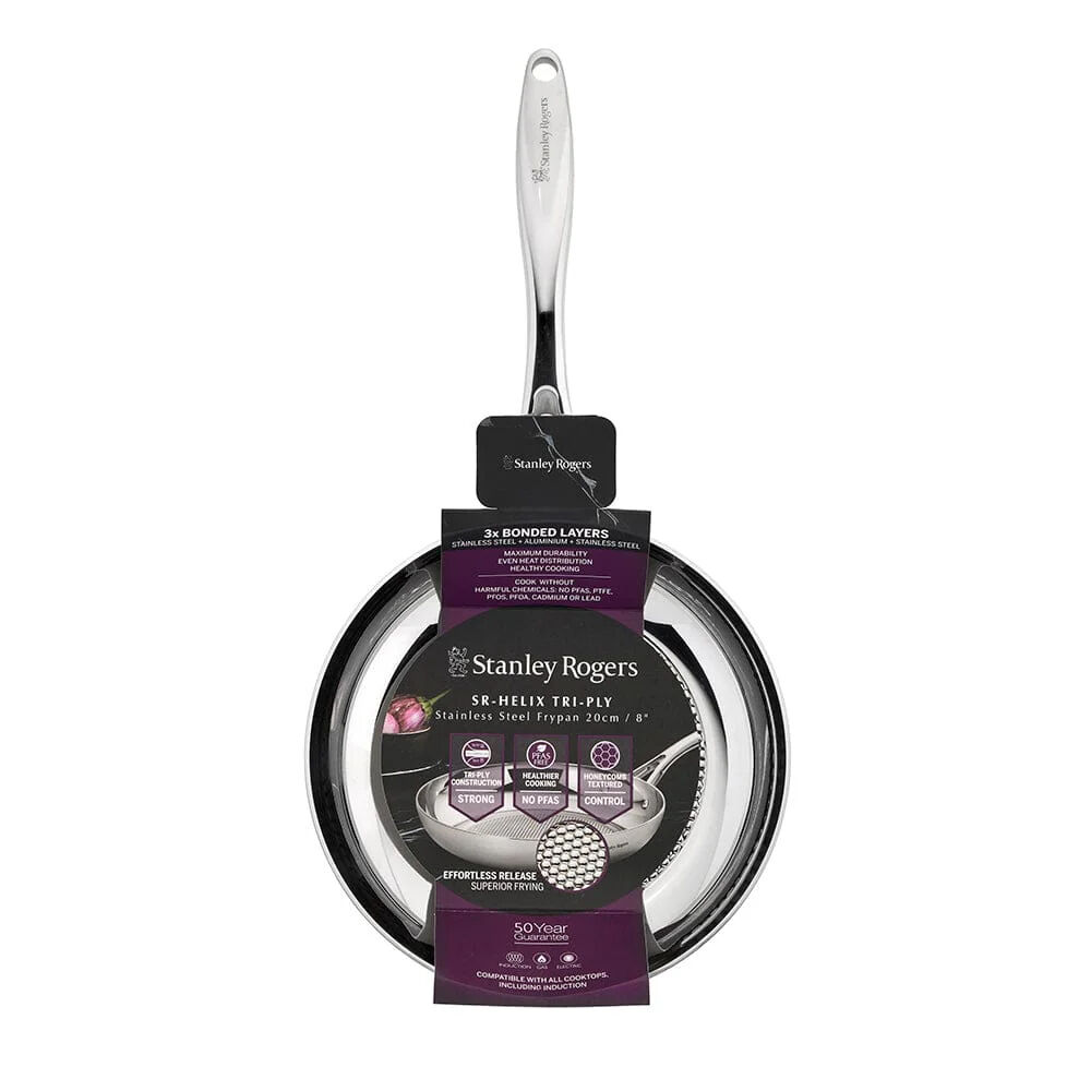 The Stanley Rogers Try-Ply Helix 20cm Frypan is designed for precision cooking and everyday performance. Featuring tri-ply construction, it combines stainless steel with an aluminium core for fast, even heat distribution and excellent temperature control. The compact 20cm size is perfect for eggs, small portions, and quick meals.