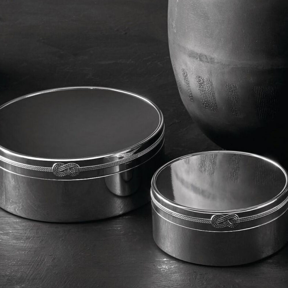The Vera Wang Wedgwood Infinity Round Keepsake Box 14 cm is crafted from silver-plated metal and features the signature interlocking loop motif, symbolising eternal love and unity. This elegant box is perfect for storing jewellery, mementos, or other precious items, adding a touch of sophistication to any space.